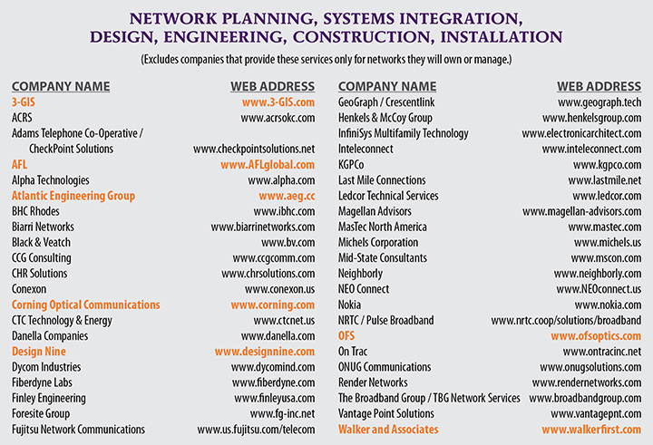The FTTH Top 100 list was researched by Marianne Cotter, Rachel Ellner and Kassandra Kania and overseen by associate editor Sean Buckley, with recommendations and advice from editor-in-chief Masha Zager. To nominate a company for next year’s FTTH Top 100, email sean@bbcmag.com.