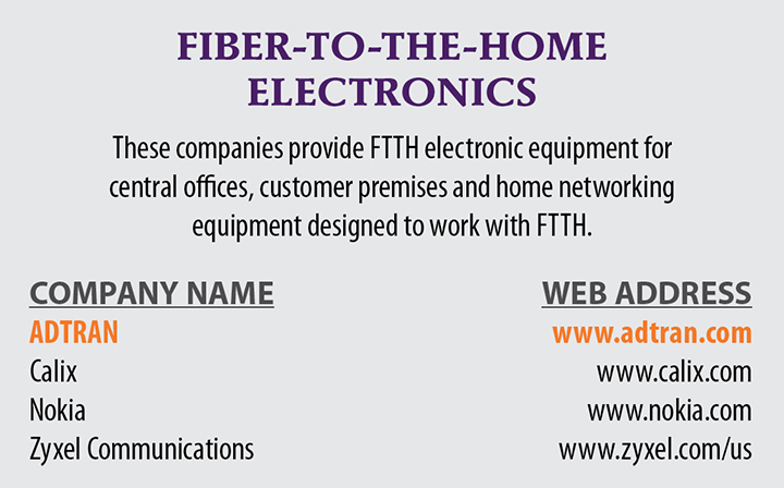 To put these pieces together requires firms that finance, plan, design, engineer, construct and install fiber optic networks, as well as those that make equipment for digging, pushing, pulling and attaching fiber. These, too, are represented on the list. Also included are a variety of organizations that advocate for better broadband or create conditions that make FTTH more profitable.