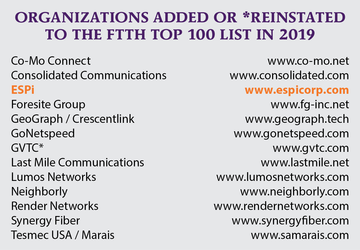 In selecting the FTTH Top 100, the editors looked for organizations that advance the cause of fiber-based broadband by