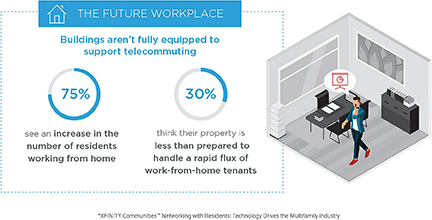 Three-quarters of respondents said they expected an increase in the number of residents working from home in the next three years, and 70 percent said their companies had made technology investments specifically to entice new tenants who worked from home or flex worked. Still, many were concerned that their properties were not fully equipped to support a work-from-home culture. Overall, 30 percent of building managers and owners thought their properties were less than prepared to handle a rapid flux of tenants who worked from home.