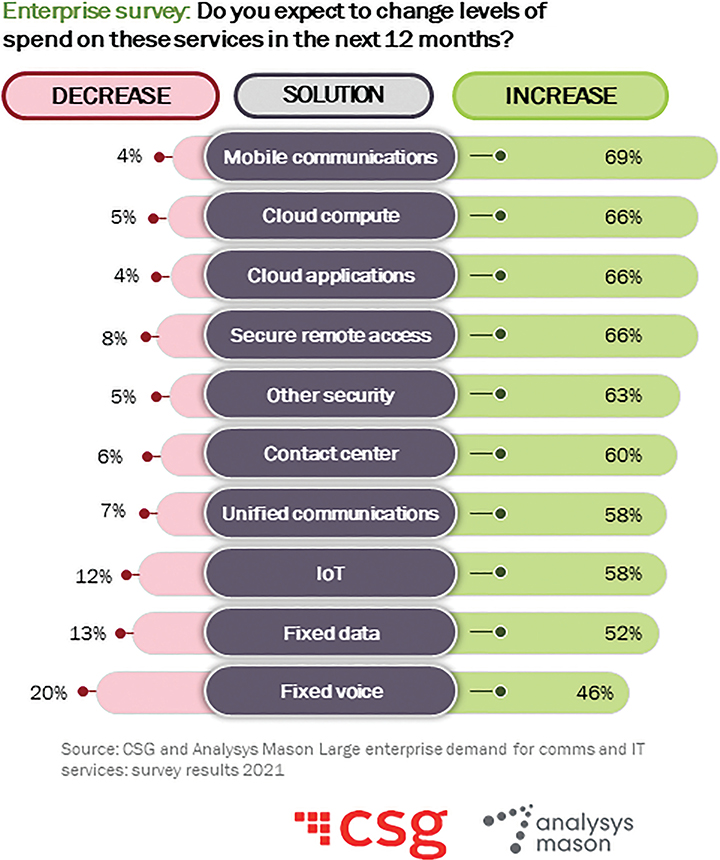 The 2020 global pivot to remote work created a boom in demand among large businesses and government agencies for new technology tools/solutions, including VPNs, secure remote access, e-commerce, unified communications, and network-as-a-service. As a result, most enterprises expect to increase their IT and communications services spending in the next 12 months. A high percentage of enterprises report an expected increase in spending on mobile communications, cloud computing and applications, and secure remote access.