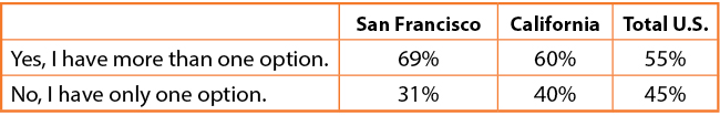 A choice in providers is the industry norm because it is good for residents and good for the attractiveness of the community. In the 2017 NMHC Telecom Survey, apartment firms reported that they had two or more service providers available at a substantial percentage of their San Francisco properties, and renters themselves acknowledge that choice exists. According to recent apartment renter preferences data, a greater share of San Francisco apartment residents have provider choice than other renters in California or even the United States as a whole. When asked in the 2017 NMHC/Kingsley Apartment Renter Preferences Survey whether they had more than one internet provider option, 69 percent of San Francisco respondents said yes, compared with 60 percent of California renters and 55 percent of renters nationally who said they had access to multiple providers.