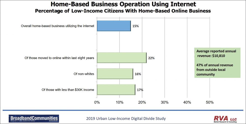 One surprise from the study is that 15 percent of the respondents operated home-based businesses that used the internet, and nearly half of that group relied on their businesses in place of formal employment. (The other half also worked at one or more jobs or were seeking work.) Entrepreneurship is typically difficult for low-income urban residents because of high rental costs and taxes, limited space availability and complicated permitting rules. Michael Render, CEO of RVA LLC, comments, “It is encouraging to see that, with online access to world markets, the ‘American dream’ seems be alive and well in this respondent segment.”