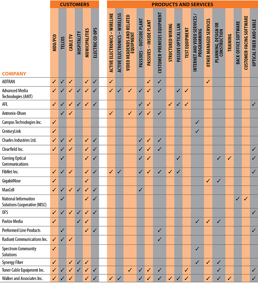 Products/Services: Video Headends and Related Equipment; Passives – Outside Plant; Passives – Inside Plant; Customer-Premises Equipment; Test Equipment; Planning, Design or Construction; Optical Fiber and Cable