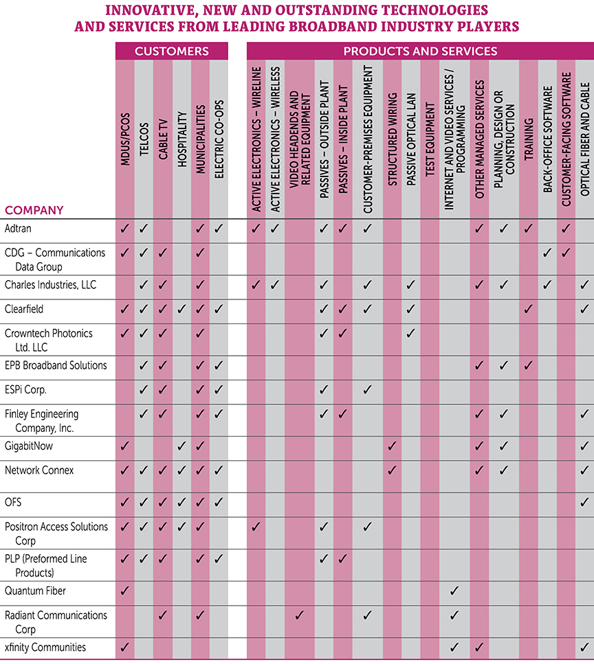 Customers: MDUs/PCOs, telcos, municipalities, electric co-ops, tribal communities Products/Services: Active electronics – wireline; active electronics – wireless; passives – outside plant; passives – inside plant; customer-premises equipment; other managed services; planning, design or construction; training; customer-facing software