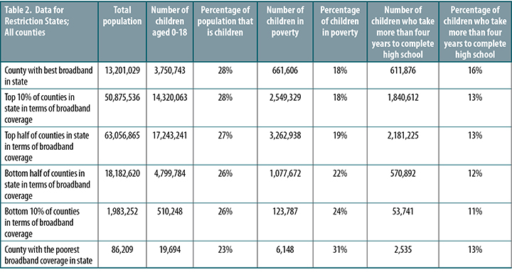 Rural counties bear the brunt of the bad news, especially when they are at the bottom of the broadband rankings. The top rural counties in “restriction” states have a child poverty rate of 13 percent. The bottom counties have a rate of 30 percent (Table 4).