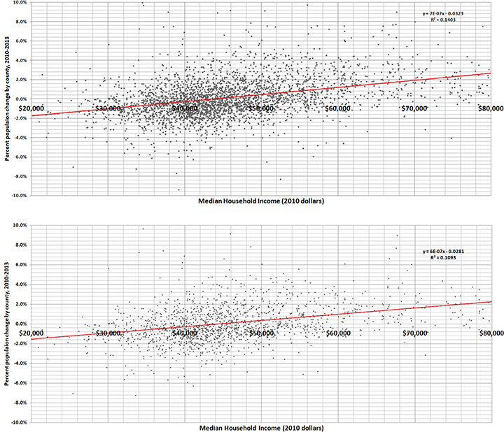 - Unlike population loss, which measures an exact phenomenon, medians are tricky. Often a median masks a bimodal distribution. For example, say a population has a lot of individuals earning $30,000 a year and many making $60,000. The median might be $45,000, even though few actually have that income. I checked scattergrams to guard against that possibility. The scattergrams reproduced with this article show that medians tend to have large error limits but, at least in rural counties, not to be bimodal.