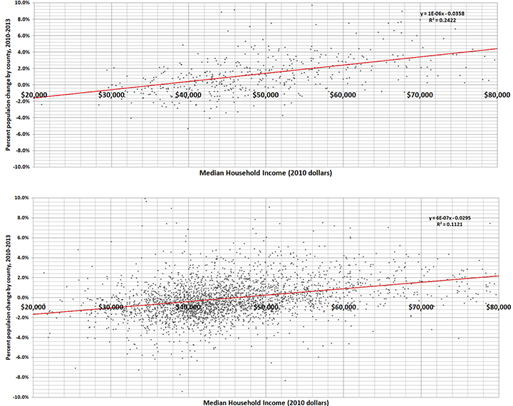 In all cases, I used population rather than income as the proxy for economic health. No job? Move to the city! Those who use population as a key variable note that it is measured more accurately than income and that its error limits (confidence intervals) are well known and are considerably smaller and more predictable than those for income.