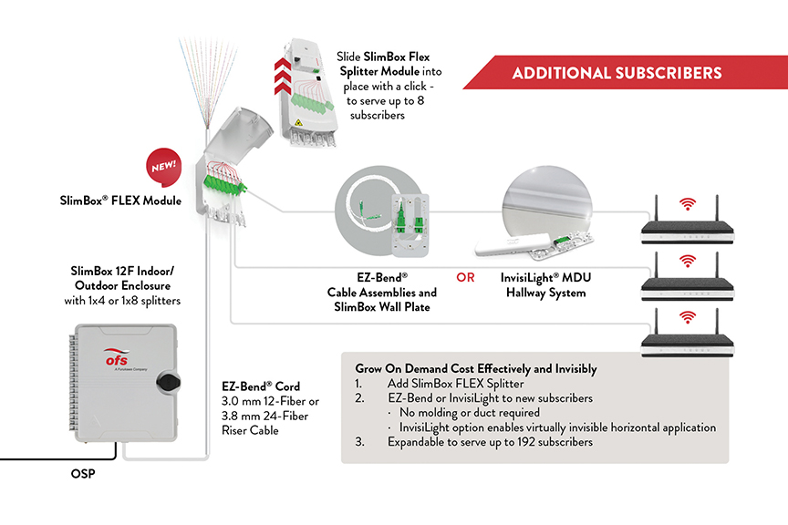 One such system is known as MDU!Click. As shown in Figure 1, the initial deployment consists of an OSP cable-fed compact splitter enclosure in the building’s main distribution frame (MDF) space and an ultra-compact riser cable passing through all floors. The first subscriber on each floor is connected by terminating a small module onto a single fiber in the riser cable and deploying a single drop cable or invisible drop fiber to the subscriber.