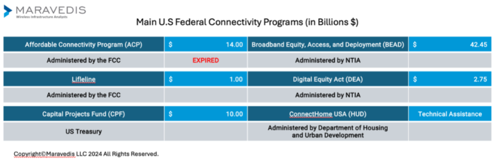 The Capital Projects Fund (CPF) program by the US Treasury has been quite successful—90 percent of the money was already disbursed to fund connectivity projects (in contrast to the more complex and slower BEAD programs which are yet to release any funds). The NTIA is managing the $42.5 billion BEAD program and the $2.75 billion Digital Equity Act programs, both of which are expected to be disbursed in 2025.
