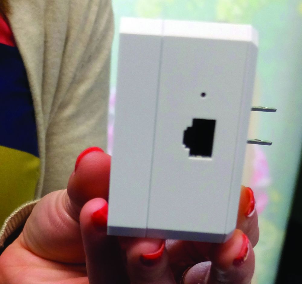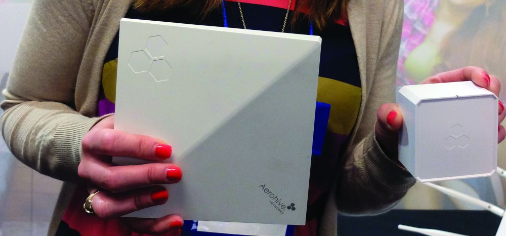 Aerohive (www.aerohiveworks.com) showed numerous variations of indoor and outdoor 802.11ac routers that selforganize into managed Wi-Fi meshes. The units, with similar form factors for various indoor and outdoor models up to 4×4:4 MU-MIMO with dual 5 GHz radios, offer aggregate data rates up to 3.46 Gbps per access point. The boxy little item is the Aerohive ATOM AP30 Dual Radio Access Point about the size of a large wall wart – and is its own wall wart. At the power socket, there is a choice of Ethernet (see the separate image) or mesh technology for data backhaul.