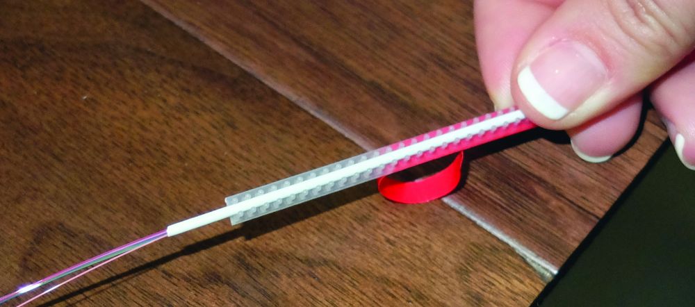 3M’s hide-the-fiber-in-plain-sight division, on its way to being acquired by Corning, continually refines its offerings for MDU deployments. Here’s the latest, which is due to be formally announced at Fiber Connect. The “duct” is a double row of mushroom-capped little nubs into which an installer can press fiber cable with up to 12 strands. The nubs protrude from self-stick flexible backing and allow the cable to be pulled out for splicing or rerouting (the image shows the red tape that protects the sticky stuff, partially peeled back).