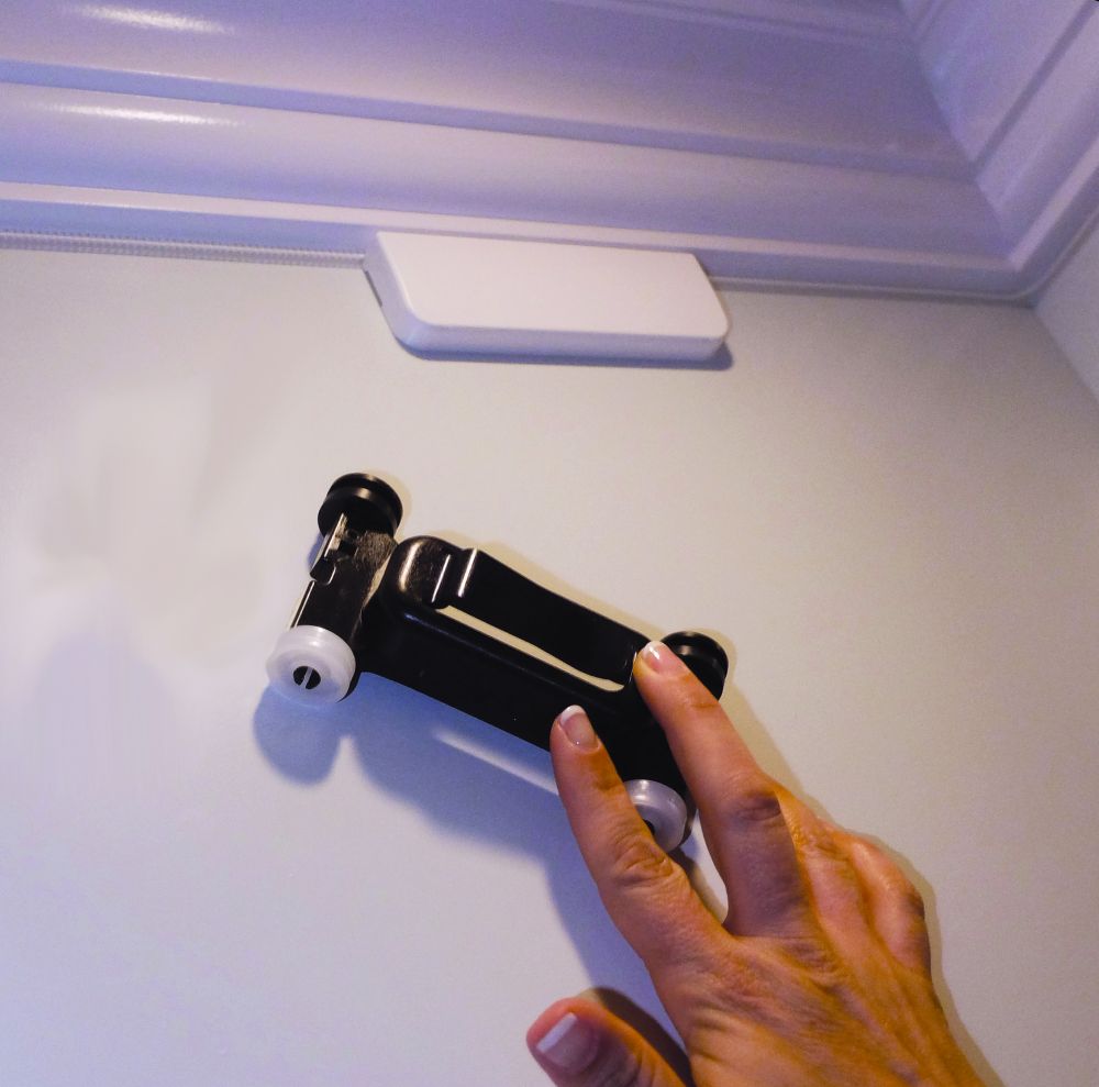 Installed high on a wall (here, barely visible just below the bottom of the ceiling molding) with the little wheeled applicator, the fiber is all but invisible. The plastic box holds slack and allows an easy drop to an apartment. The applicator is a refined version of one first introduced years ago.