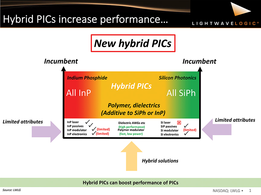 At the left side of the graph (shaded in red) is indium phosphide semiconductor material, an incumbent technology platform for PICs. Silicon photonics is on the right side of the chart (shaded in green), an incumbent technology platform based on silicon for PICs. Though these PIC platforms have delivered relative success over the past decade as pure-play platforms, they need more modulator performance. Silicon is primarily regarded as impractical for laser emission in commercial products. Mixing and matching photonic materials such as EO polymers and dielectrics into these incumbent platforms has enabled much higher performance in PIC design (as shown in the center of the chart).