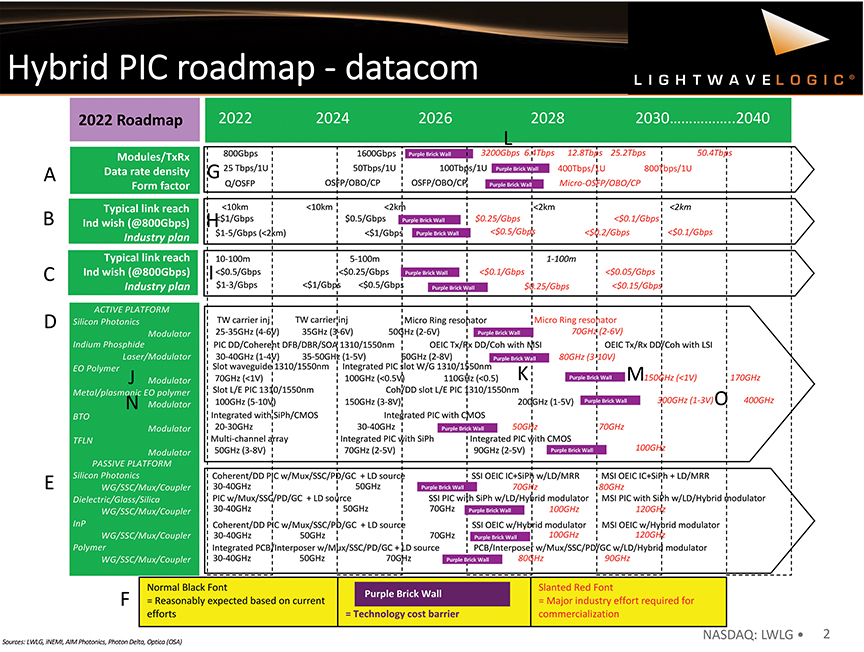 The Purple Brick Wall for EO polymers is forecasted in the 2028-2029 time frame with EO bandwidths approaching 150 GHz and voltage levels below 0.5 volts (see M in Figure 2). Optical modulators with this type of performance could quickly drive data rates of 200 Gbps NRZ (a simple square wave or castellated waveform) as well as 400GBaud PAM4, which is more than double the performance of today. For example, a four-four-channel baud PAM4 modulator PIC enables 1.6 Tbps transceivers, and a highlight-channel baud PAM4 PIC could potentially be 3.2 Tbps transceivers.