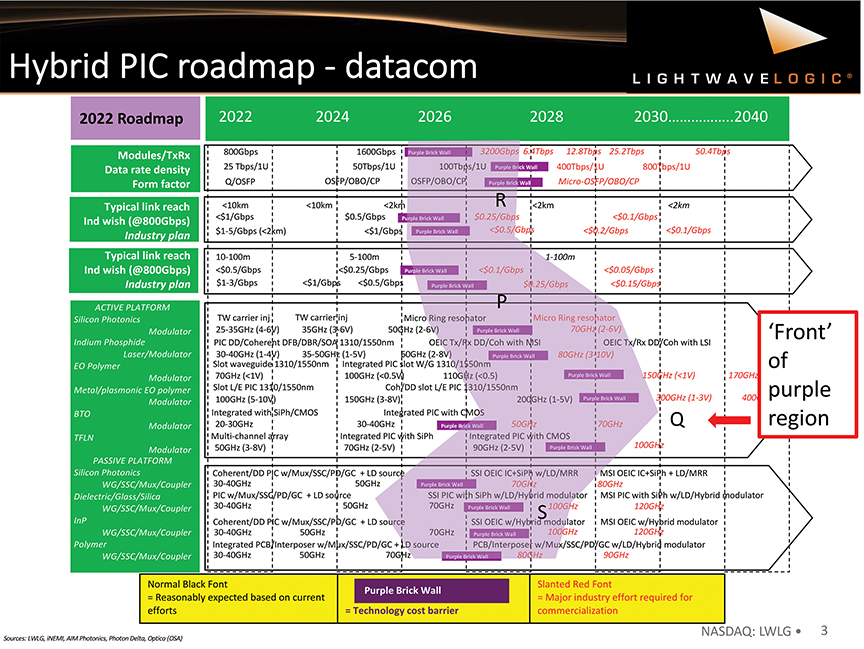Figure 3 shows the exact road map with an extra level of analysis. This purple region roughly covers all the Purple Brick Walls that have taken an approximate “S” shape (see P in Figure 3). The right-most front of this purple region is represented by EO polymer technologies such as slot and plasmonic (see Q in Figure 3). This indicates that with average R&D investment, the performance of EO polymers will exceed that of other modulator technologies. The lagging fronts of the purple region (see R and S in Figure 3) show that extra industry R&D effort is needed to achieve the forecasted metrics that datacom transceivers using hybrid PICs will require.