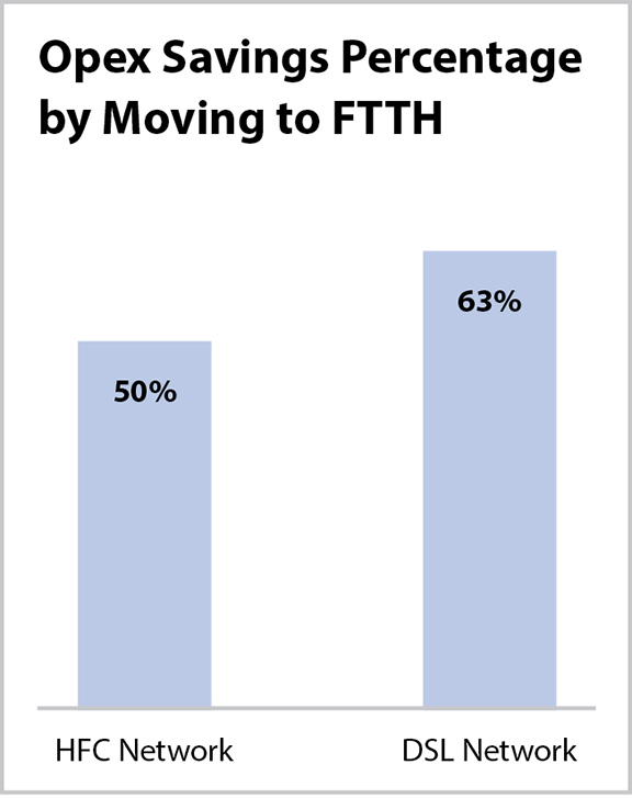 Some individual deployers have tried to quantify fiber’s operational savings – for example, Verizon has cited a 60 percent savings for FTTH relative to DSL (copper). Some smaller providers, in response to surveys, have estimated savings of about 40 percent relative to DSL or hybrid fiber-coax (HFC), but most of these measurements were informal.