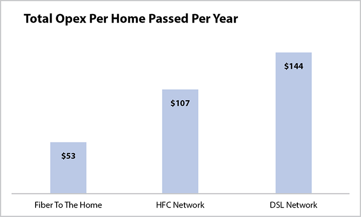 Much more important to total cost is fiber’s reliability. Fiber simply doesn’t fail as often as copper or coax. That yields two major operational savings: First, operators don’t have to spend as much time or effort fixing network problems. And second, because customers don’t become frustrated by network instability, operators don’t have to spend as much money acquiring customers.