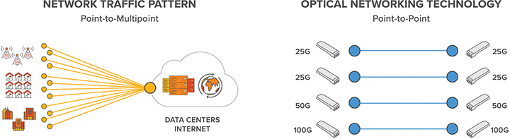 In contrast, optical connectivity solutions are implemented using strictly point-to-point technology as depicted in Figure 1. The result is an extremely inefficient transport architecture that requires large numbers of bookended transceivers and numerous intermediate aggregation devices to “up-speed” traffic flows. But this is about to change thanks to XR optics.