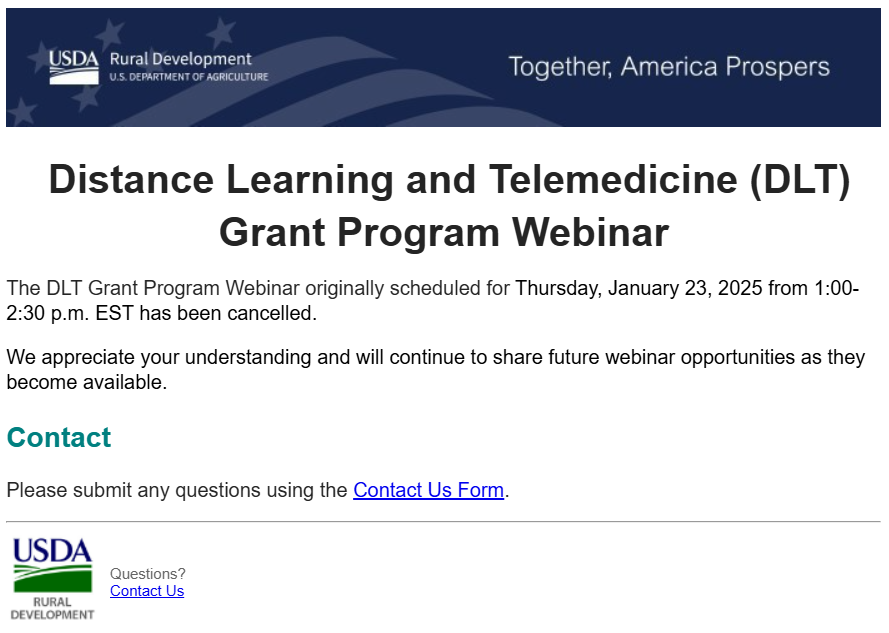 “The DLT Grant Program Webinar originally scheduled for Thursday, January 23, 2025 from 1:00-2:30 p.m. EST has been cancelled,” an email update, sent Wednesday from the USDA read. “We appreciate your understanding and will continue to share future webinar opportunities as they become available.”